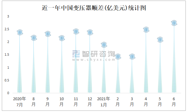 近一年中國變壓器順差(億美元)統計圖