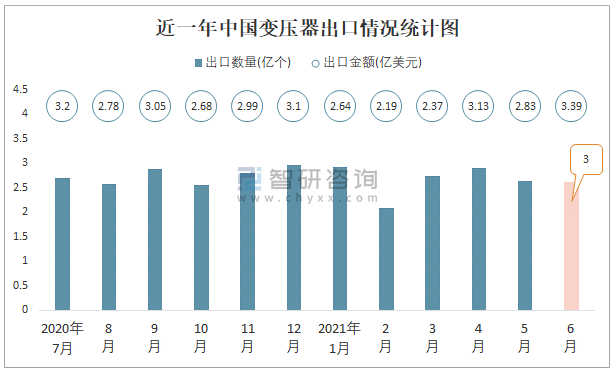 根據中國海關數據顯示:2021年6月中國變壓器進口數量為0.89億個,同比下降9.3%,進口金額為0.64億美元,同比增長6.4%,2021年6月中國變壓器出口數量為2.62億個,同比增長23.8%,出口金額為3.39億美元,同比增長48.3%;2021年1-6月中國變壓器進口數量為5.39億個,進口金額為4.45億美元,出口數量為15.9億個,出口金額為16.56億美元。