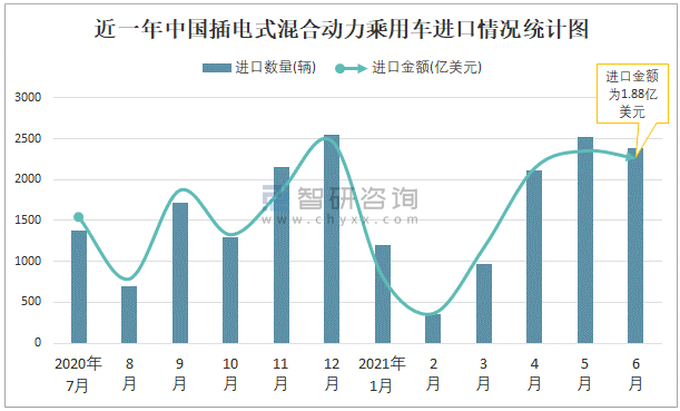 根據(jù)中國海關(guān)數(shù)據(jù)顯示:2021年6月中國插電式混合動(dòng)力乘用車進(jìn)口數(shù)量為2384輛,同比增長215.3%,進(jìn)口金額為1.88億美元,同比增長172.5%,2021年6月中國插電式混合動(dòng)力乘用車出口數(shù)量為6339輛,同比增長242.3%,出口金額為2.18億美元,同比增長200%;2021年1-6月中國插電式混合動(dòng)力乘用車進(jìn)口數(shù)量為9532輛,進(jìn)口金額為7.6億美元,出口數(shù)量為20304輛,出口金額為6.91億美元。