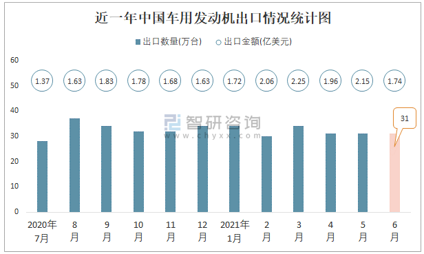 根據中國海關數據顯示:2021年6月中國車用發動機進口數量為3萬臺,同比下降57.3%,進口金額為0.82億美元,同比下降47.2%,2021年6月中國車用發動機出口數量為31萬臺,同比增長26.8%,出口金額為1.74億美元,同比增長78.5%;2021年1-6月中國車用發動機進口數量為27萬臺,進口金額為7.28億美元,出口數量為191萬臺,出口金額為11.86億美元。