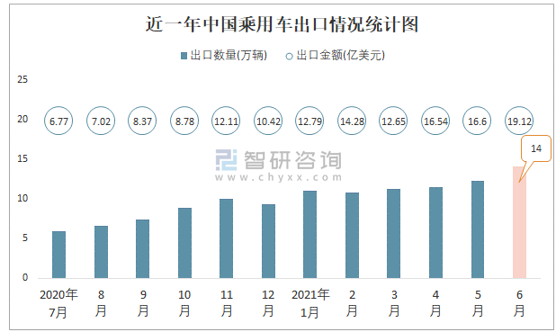 根據(jù)中國海關(guān)數(shù)據(jù)顯示:2021年6月中國乘用車進口數(shù)量為10.58萬輛,同比增長29.8%,進口金額為56.65億美元,同比增長52.1%,2021年6月中國乘用車出口數(shù)量為14.12萬輛,同比增長219.7%,出口金額為19.12億美元,同比增長200%;2021年1-6月中國乘用車進口數(shù)量為52.83萬輛,進口金額為280.92億美元,出口數(shù)量為70.88萬輛,出口金額為91.98億美元。