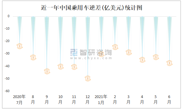 近一年中國乘用車逆差(億美元)統(tǒng)計圖