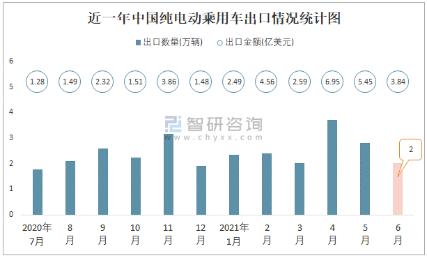 根據(jù)中國海關數(shù)據(jù)顯示:2021年6月中國純電動乘用車進口數(shù)量為0.12萬輛,同比增長15.5%,進口金額為1.03億美元,同比增長67%,2021年6月中國純電動乘用車出口數(shù)量為2.02萬輛,同比增長156.7%,出口金額為3.84億美元,同比增長159%;2021年1-6月中國純電動乘用車進口數(shù)量為0.61萬輛,進口金額為5.48億美元,出口數(shù)量為15.3萬輛,出口金額為25.86億美元。