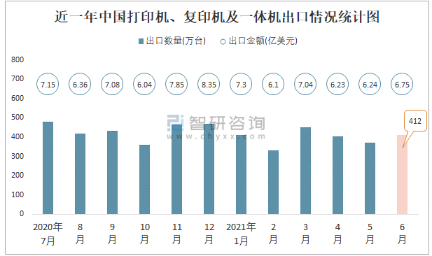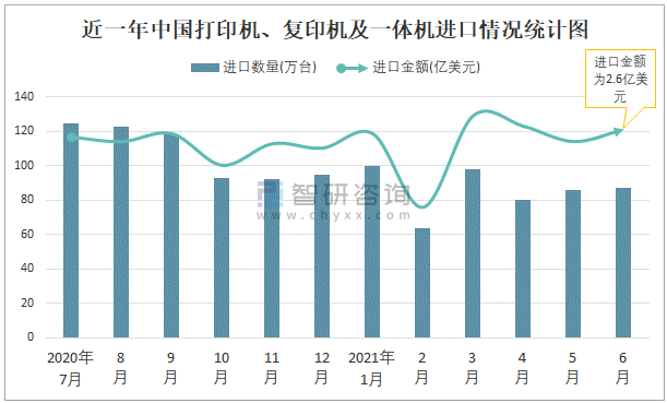 根據中國海關數據顯示:2021年6月中國打印機、復印機及一體機進口數量為87.05萬臺,同比下降34.5%,進口金額為2.6億美元,同比增長11.7%,2021年6月中國打印機、復印機及一體機出口數量為412.29萬臺,同比增長19.9%,出口金額為6.75億美元,同比增長21.9%;2021年1-6月中國打印機、復印機及一體機進口數量為513.96萬臺,進口金額為14.64億美元,出口數量為2381.65萬臺,出口金額為39.66億美元。