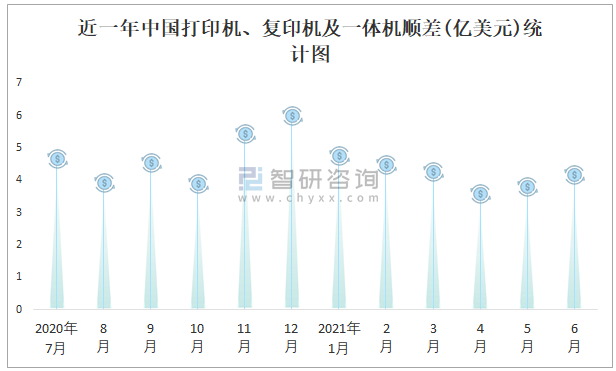 近一年中國打印機、復印機及一體機順差(億美元)統計圖