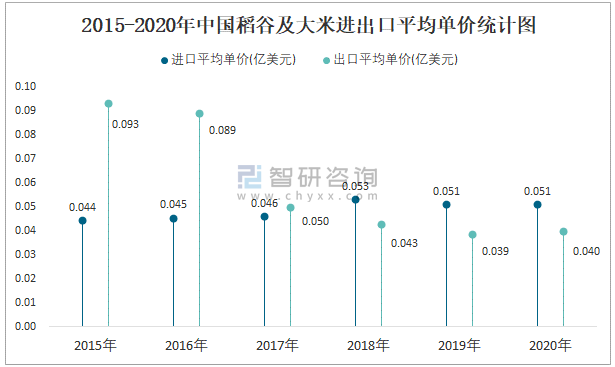 2015-2020年中國(guó)稻谷及大米進(jìn)出口平均單價(jià)統(tǒng)計(jì)圖