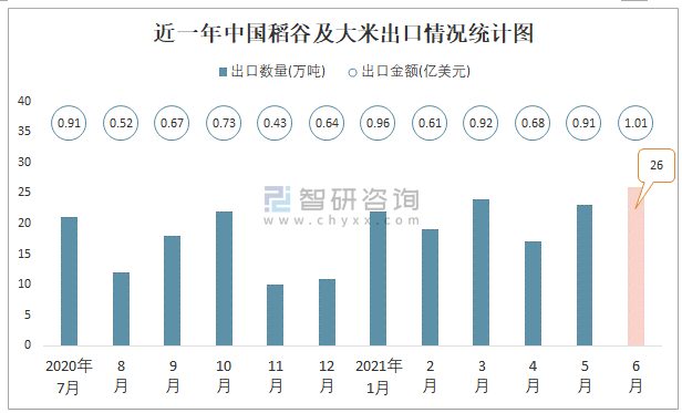 近一年中國(guó)稻谷及大米出口情況統(tǒng)計(jì)圖