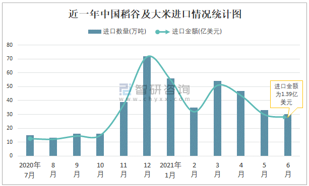 近一年中國(guó)稻谷及大米進(jìn)口情況統(tǒng)計(jì)圖