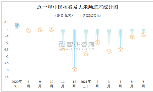 近一年中國(guó)稻谷及大米順逆差統(tǒng)計(jì)圖