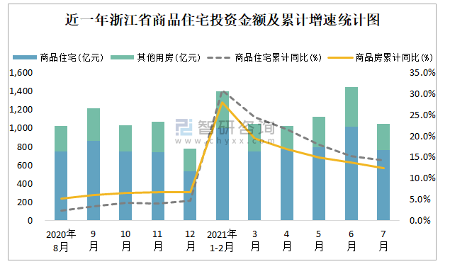 根據國家統計局數據統計可知:2021年7月浙江省房地產開發投資商品房投資金額為1045.84億元(其中商品住宅為763.14億元,辦公樓、商業營業用房等其他用房282.7億元);2021年1-7月浙江省房地產開發投資商品住宅累計投資金額為5089.14億元,投資金額累計同比增長14.3%。