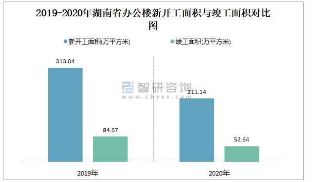 2019-2020年湖南省辦公樓新開工面積與竣工面積對比圖