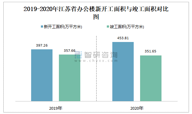 2019-2020年江蘇省辦公樓新開工面積與竣工面積對比圖
