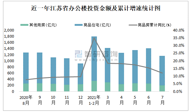 根據(jù)國家統(tǒng)計局數(shù)據(jù)統(tǒng)計可知:2021年7月江蘇省房地產(chǎn)開發(fā)投資商品房投資金額為1161.16億元,其中包括辦公樓、商業(yè)營業(yè)用房等其他用房205.55億元(注:辦公樓、商業(yè)營業(yè)用房未分開統(tǒng)計);2021年1-7月江蘇省房地產(chǎn)開發(fā)投資包括辦公樓在內(nèi)的其他用房累計金額為1639.75億元。
