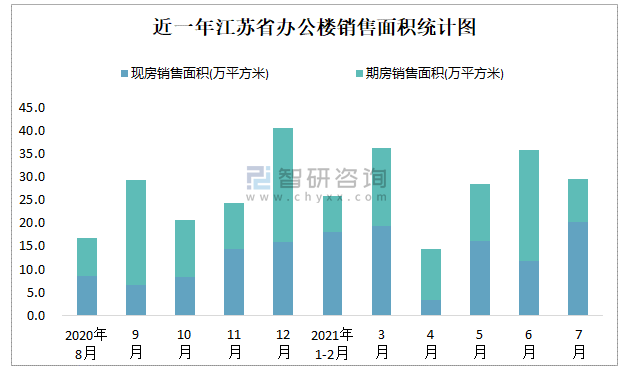 根據(jù)國家統(tǒng)計局數(shù)據(jù)可知:2021年7月江蘇省辦公樓銷售面積為29.51萬平方米(其中銷售現(xiàn)房20.19萬平方米,期房9.32萬平方米);2021年1-7月江蘇省辦公樓累計銷售面積為170.4萬平方米;近一年江蘇省辦公樓期房銷售面積遠高于現(xiàn)房銷售面積,2021年7月四川、廣東、江蘇的辦公樓銷售面積最多,江蘇、上海、浙江、廣東的辦公樓現(xiàn)房銷售面積高于其他各省市。