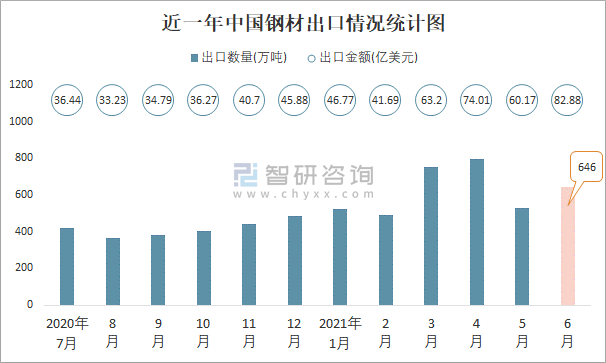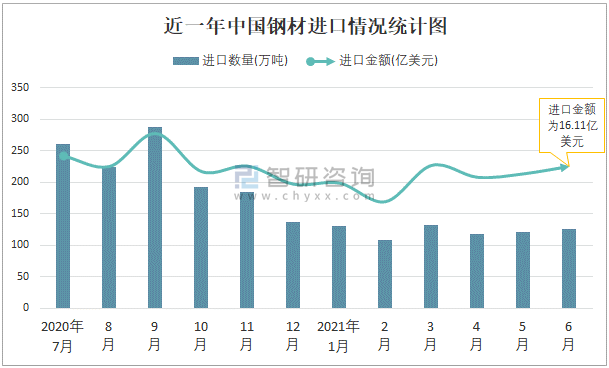 根據中國海關數(shù)據顯示:2021年6月中國鋼材進口數(shù)量為125萬噸,同比下降33.4%,進口金額為16.11億美元,同比增長13%,2021年6月中國鋼材出口數(shù)量為646萬噸,同比增長74.5%,出口金額為82.88億美元,同比增長145.7%;2021年1-6月中國鋼材進口數(shù)量為735萬噸,進口金額為88.67億美元,出口數(shù)量為3738萬噸,出口金額為368.67億美元。