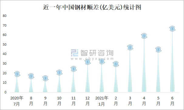 近一年中國鋼材順差(億美元)統(tǒng)計圖