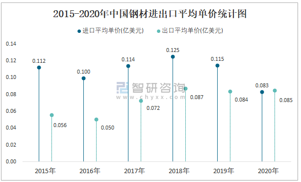 2015-2020年中國鋼材進出口平均單價統(tǒng)計圖