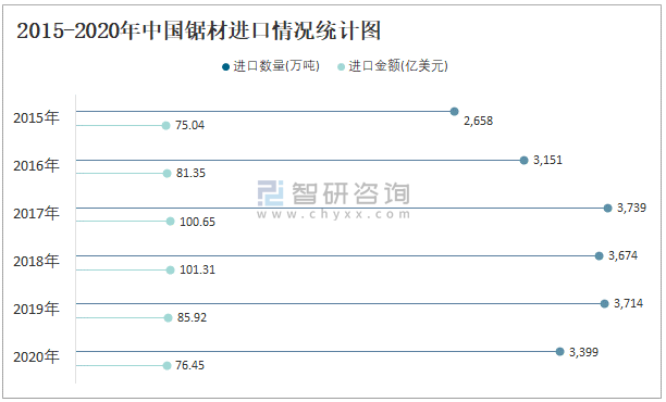 根據中國海關數據顯示:2021年6月中國鋸材進口數量為263萬立方米,同比下降25%,進口金額為6.68億美元,同比下降15.9%,2021年1-6月中國鋸材進口數量為1406萬立方米,進口金額為35.73億美元。