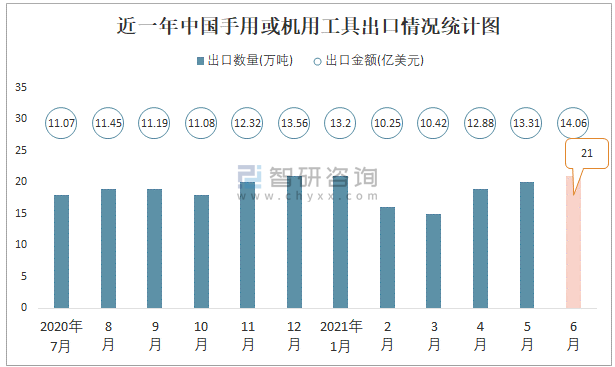 2021年6月中國手用或機用工具出口數量為21萬噸,同比增長21.4%,出口金額為14.06億美元,同比增長30.5%;2021年1-6月中國手用或機用工具,出口數量為112萬噸,出口金額為74.08億美元。