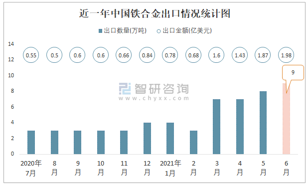 近一年中國鐵合金出口情況統計圖