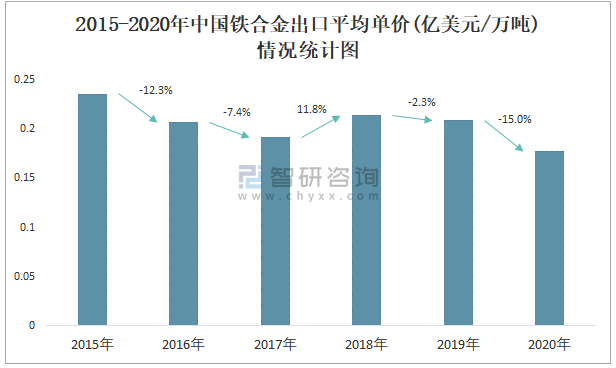 2015-2020年中國鐵合金出口平均單價(億美元/萬臺)情況統計圖