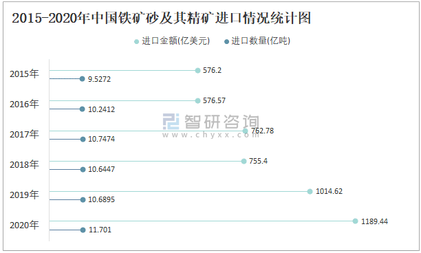 2015-2020年中國鐵礦砂及其精礦進口情況統計圖