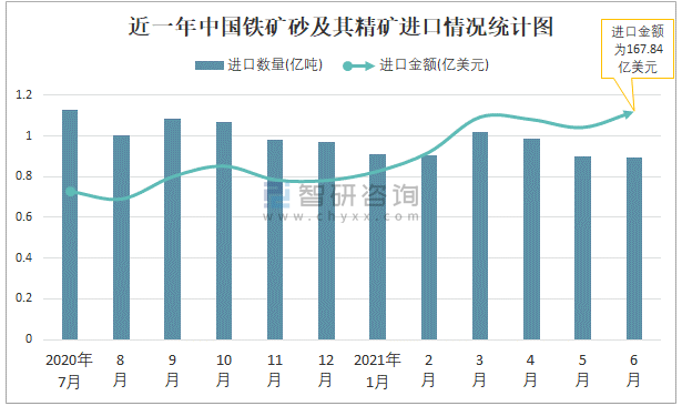 2021年6月中國鐵礦砂及其精礦進口數量和進口金額分別為0.89億噸和167.84億美元