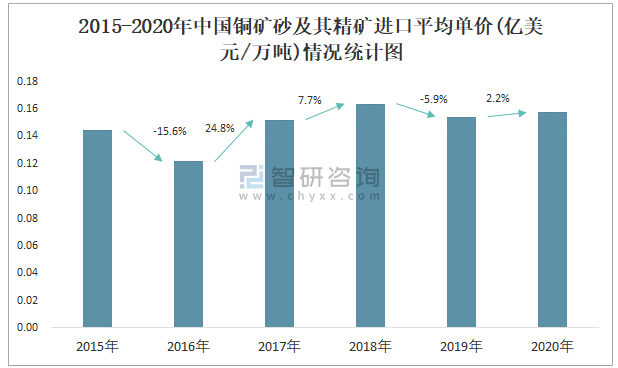 根據中國海關數據顯示:2015-2020年中國銅礦砂及其精礦進口數量2019年達到最大值,此后有所下降,進口金額逐年遞增;2015-2020年中國銅礦砂及其精礦進口平均單價2017年增長速度最快,而2016年中國銅礦砂及其精礦進口平均單價下降速度最快,下滑了15.6%。