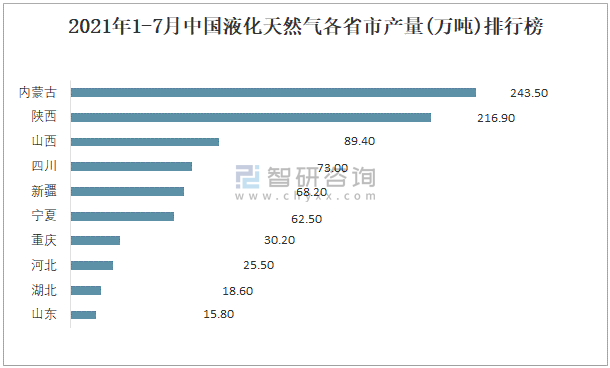 2021年1-7月中國液化天然氣各省市產量排行榜