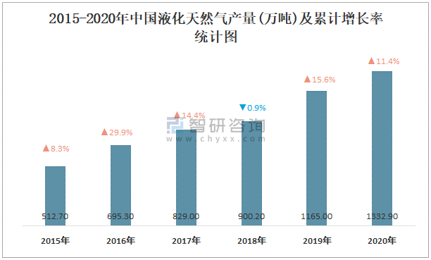 2015-2020年中國液化天然氣產量及增長率統計圖