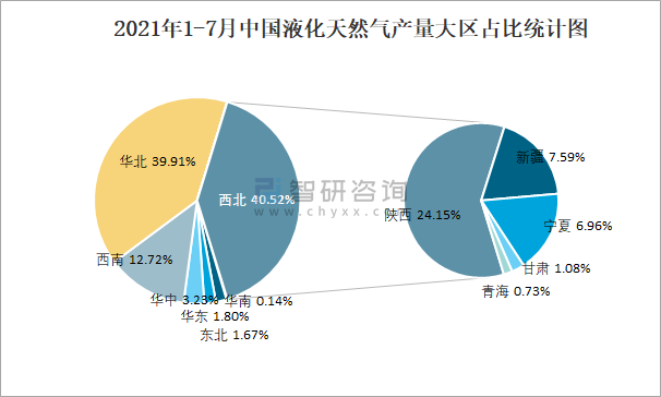 2021年1-7月中國液化天然氣產量大區占比統計圖