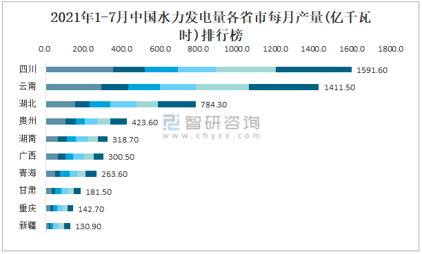 2021年1-7月中國水力發電量各省市每月產量排行榜