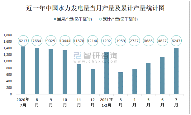 根據國家統計局數據顯示:2021年7月中國水力發電量產量為1422億千瓦時,同比下降4.3%;2021年1-7月中國水力發電量累計產量為6247.4億千瓦時,累計下降0.1%;2015-2020年中國水力發電量產量逐年遞增,2020年達到最高。