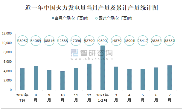 根據國家統計局數據顯示:2021年7月中國火力發電量產量為5240億千瓦時,同比增長12.7%;2021年1-7月中國火力發電量累計產量為33537.4億千瓦時,累計增長14.7%;2015-2020年中國火力發電量產量逐年遞增,2020年達到最高。