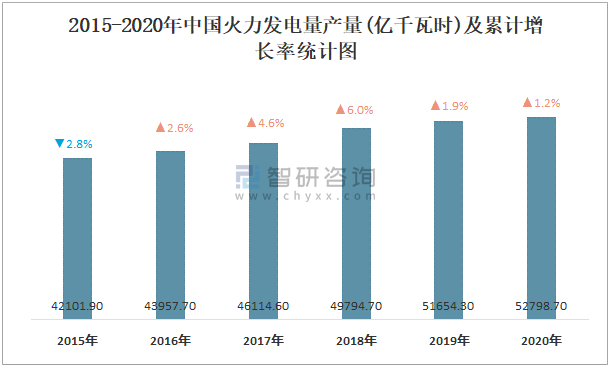 2015-2020年中國火力發電量產量及增長率統計圖