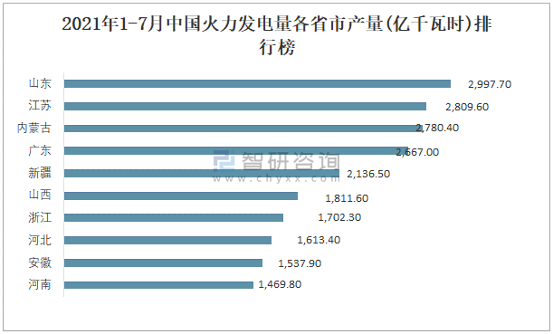 2021年1-7月中國火力發電量各省市產量排行榜