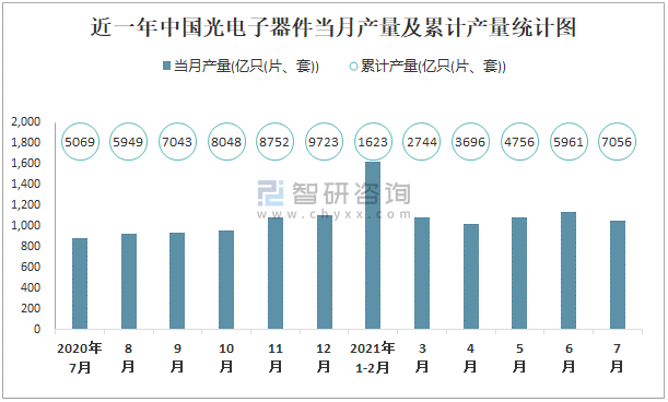 2021年1-7月中國光電子器件產量為7055.5億只(片、套) 累計增長42.1%