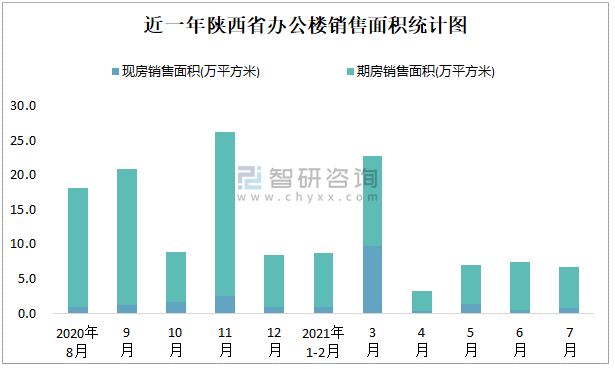 2021年7月陜西省辦公樓銷售面積為6.75萬平方米(現房銷售面積占比12.15%)