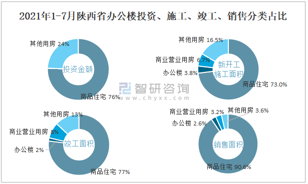 根據國家統計局數據統計可知:2021年1-7月陜西省房地產開發企業在包括辦公樓在內的其他用房投資金額占比為24.4%(注:只有投資金額中其他用房包含辦公樓、商業營業用房),辦公樓的新開工面積與竣工面積所占比重差異不大,從銷售面積來看,辦公樓銷售面積占比少于商業營業用房銷售面積占比。