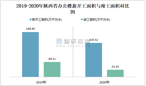 2019-2020年陜西省辦公樓新開工面積與竣工面積對比圖