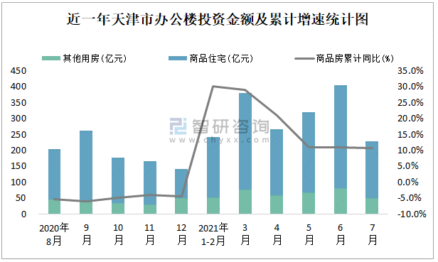 根據(jù)國(guó)家統(tǒng)計(jì)局?jǐn)?shù)據(jù)統(tǒng)計(jì)可知:2021年1-7月天津市房地產(chǎn)開發(fā)企業(yè)在包括辦公樓在內(nèi)的其他用房投資金額占比為20.9%(注:只有投資金額中其他用房包含辦公樓、商業(yè)營(yíng)業(yè)用房),辦公樓的新開工面積與竣工面積所占比重差異不大,從銷售面積來(lái)看,辦公樓銷售面積占比少于商業(yè)營(yíng)業(yè)用房銷售面積占比。