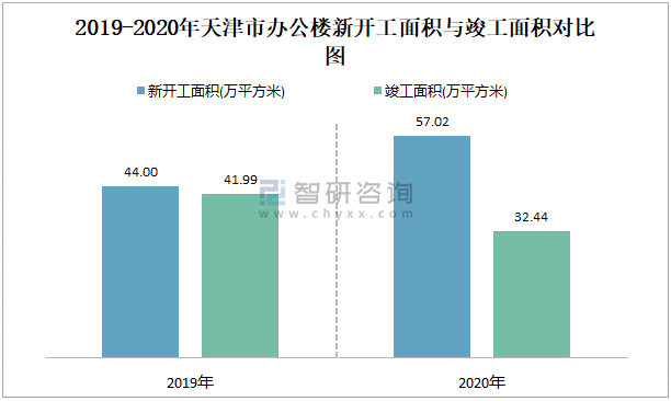 2019-2020年天津市辦公樓新開工面積與竣工面積對(duì)比圖