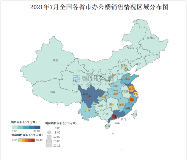 2021年7月全國各省市辦公樓銷售情況區域分布圖