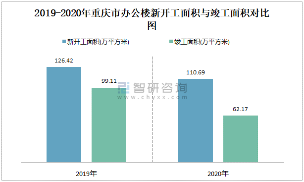 2019-2020年重慶市辦公樓新開工面積與竣工面積對比圖