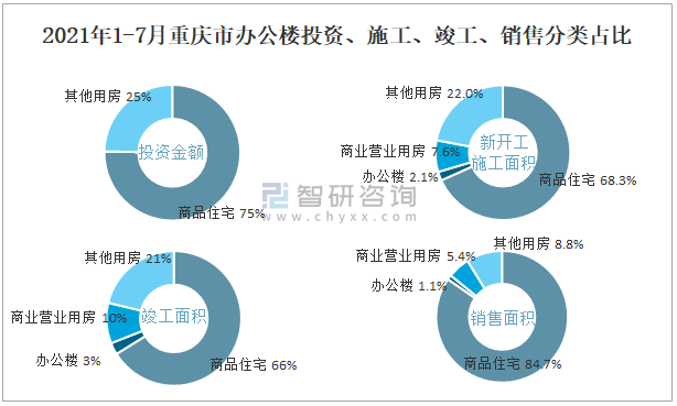 根據國家統計局數據統計可知:2021年1-7月重慶市房地產開發企業在包括辦公樓在內的其他用房投資金額占比為24.7%(注:只有投資金額中其他用房包含辦公樓、商業營業用房),辦公樓的新開工面積與竣工面積所占比重差異不大,從銷售面積來看,辦公樓銷售面積占比少于商業營業用房銷售面積占比。