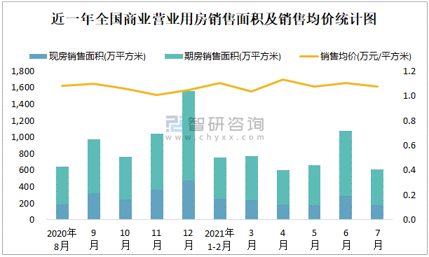 根據(jù)國家統(tǒng)計局數(shù)據(jù)可知:2021年7月全國商業(yè)營業(yè)用房銷售面積為605.47萬平方米(其中銷售現(xiàn)房178.95萬平方米,期房426.52萬平方米),銷售額為652.54億元,銷售均價約為1.08萬元/平方米;2021年1-7月全國商業(yè)營業(yè)用房累計銷售面積為4473.04萬平方米,銷售面積累計同比增長3.8%,累計銷售額為4868.78億元,銷售額累計同比增長5%;近一年全國商業(yè)營業(yè)用房銷售均價2021年4月達到最高值,此后有所下滑,期房銷售面積遠高于現(xiàn)房銷售面積。