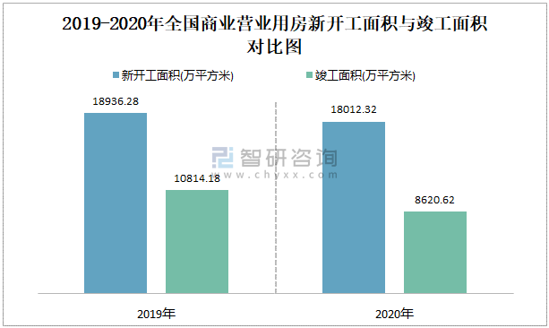 2019-2020年全國商業(yè)營業(yè)用房新開工面積與竣工面積對比圖
