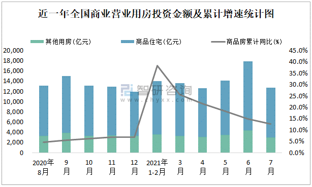 根據(jù)國家統(tǒng)計局數(shù)據(jù)統(tǒng)計可知:2021年7月全國房地產(chǎn)開發(fā)投資商品房投資金額為12716.34億元,其中包括辦公樓、商業(yè)營業(yè)用房等其他用房2980.28億元(注:辦公樓、商業(yè)營業(yè)用房未分開統(tǒng)計);2021年1-7月全國房地產(chǎn)開發(fā)投資包括商業(yè)營業(yè)用房在內(nèi)的其他用房累計金額為20915.13億元。