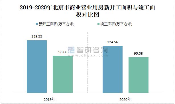 2019-2020年北京市商業(yè)營業(yè)用房新開工面積與竣工面積對比圖