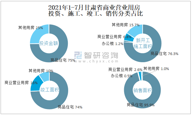 根據國家統計局數據統計可知:2021年1-7月甘肅省房地產開發企業在包括商業營業用房在內的其他用房投資金額占比為25.3%(注:只有投資金額中其他用房包含辦公樓、商業營業用房),商業營業用房的新開工面積與竣工面積所占比重差異不大,從銷售面積來看,商業營業用房銷售面積占比高于辦公樓銷售面積占比。